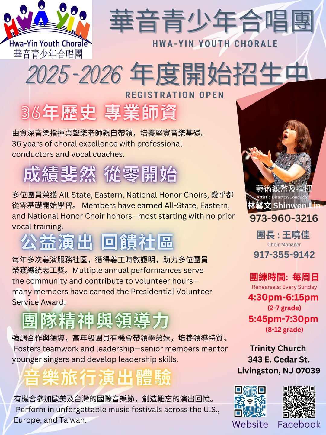 The Northern New Jersey Chinese American Hwa-Yin Youth Chorale was founded in 1989 with the goal of nurturing, enriching, and broadening the cultural horizons of children through music education. Hwa-Yin is a non-profit, self-funded organization currently under the direction of Shinwen Lin, a distinguished conductor, educator, and vocalist.Our members, whose grades range from second to twelve, compose a very diverse group from all over Northern New Jersey. They rehearse every Sunday afternoon during the school year. Music is a universal language that invokes profound emotions and allows all to communicate their love toward each other. Hwa-Yin represents not only a venue by which to gain music skill and appreciation, but also an opportunity to learn about global musical cultures and make local connections.1989年10月,由一群熱愛音樂的華人父母們於北新澤西州創立了華音青少年合唱團。華音宗旨為培養優秀及熱愛音樂的青年團員,也期望下一代青年子弟能藉著音樂文化的認同和心靈的交流,在音樂藝術上茁壯成長。華音首先在受人敬重的尤美文女士指導下奠定深厚的音樂根基,之後由胡蔡茜利女士及喻笙華博士共同扶植,為華音建立了在北新澤西州的盛名,華音合唱團並被新州星報譽為“北新澤西瑰寶”。 2002年林馨文女士接任第四任指揮暨藝術總監。林指揮以無怨無悔的愛心及耐心為華音盡心盡力,並培養華音團員的成長。華音除了以美妙的中英文歌聲打動人心邁向主流社會,在音樂領域上更上一層樓,每年並有多名華音合唱團團員甄選上新澤西州、美東、全國榮譽合唱團。華音精彩的演出深獲各界好評,除了每年度的盛大公演,平日也積極參與社區和慈善義演,並且經常受邀到各地表演。1992年第一場跨海之旅,遠赴台灣及菲律賓表演。1994年參加中國北京國際合唱節活動。1996年受邀於新澤西芭蕾舞節開幕表演。1997年參加捷克布拉格國際音樂節,同年12月並參與14個合唱團於卡內基廳所表演的“為和平而歌”音樂會。1999年參加英國倫敦國際兒童合唱節表演。2004年受邀佛州迪士尼世界表演,同年並參加奧地利維也納Advent Singing音樂節。2006年及2007年和悅悅小集合唱團分別於紐約林肯中心及新澤西羅格斯大學演出。2013年遠赴台灣與台北市士東國小、蘭雅國中弦樂團舉辦聯合音樂會, 2014年與加州愛之聲合唱團及真善美女聲合唱團舉辦聯合音樂會, 2015年感恩節假期再赴奧地利參加國際音樂。2018年4月參加在紐約市林肯中心所舉辦的Distinguished Concerts Singers International表演。2019年8月遠赴捷克布拉格音樂之都表演。合唱團每周日下午練唱,練習課程包含試唱,聲樂訓練,聽力訓練及音樂欣賞。在多年努力之下,華音合唱團的精彩演出不僅深得各界好評,團員們也藉此提升了音樂表達能力和技巧,同時也培養出團員間濃厚的友誼、責任感及團隊精神。我們期許華音合唱團及團員們除了在歌唱及表演上有所成長,也能將優美的歌聲散播各地,體現音樂無國界的精神。